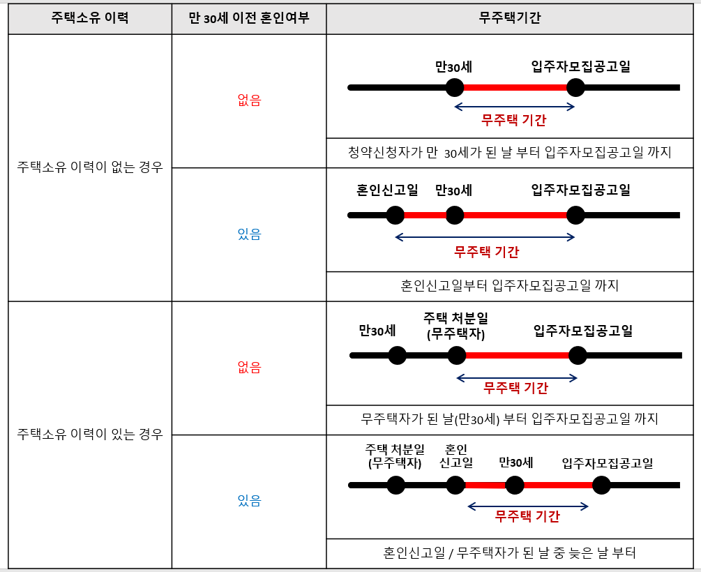 무주택 기간 산정에 대한 자세한 내용은 아래 표로 정리해 놓았으니 참고하시길 바랍니다.
